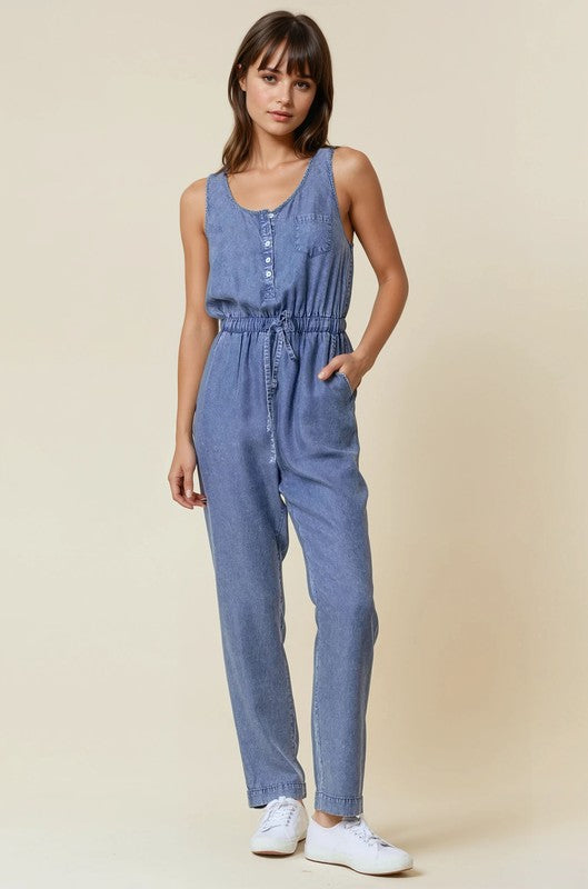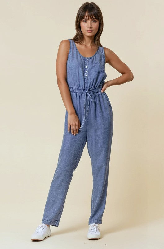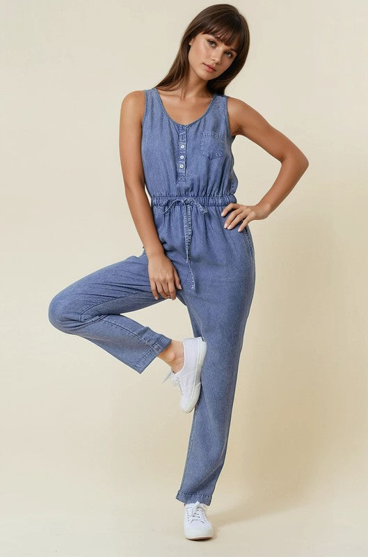 Stylish tencel denim jumpsuit with a comfortable scoop neckline - Functional button-up henley style front - Convenient chest pocket for small essentials - Adjustable drawstring waist for a customized fit
