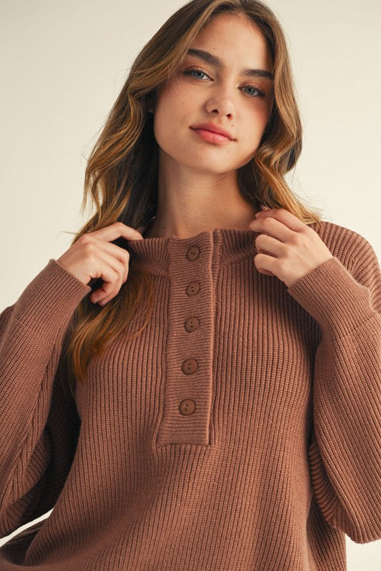 The color of the season! This relaxed fit sweater features a button down front and drop shoulders.